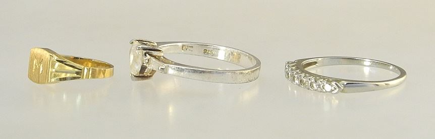 3 Rings: Childs 10K (marked, size 1 1/4) / Sterling (size 8), Unmarked (size 7 1/2).