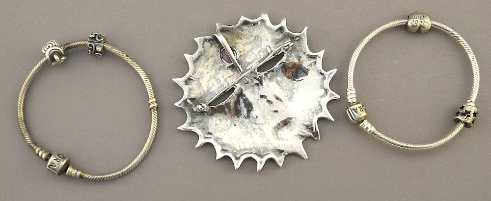 2 Pandora Bracelets with 4 Various Charms & Unmarked Sun Brooch, TW 83 g.