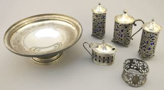 LOT 79 Silver Condiment Set & Napkin Ring. Estimate: $80 - $120 Sold For: $100 Auction Date: Tuesday, April 16 2024 at 4:00 PM