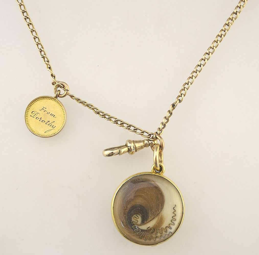 9c Gold Mourning Pendant on Watch Chain with 14K Lord's Prayer Fob, 29 1/2"l, 21.9g.