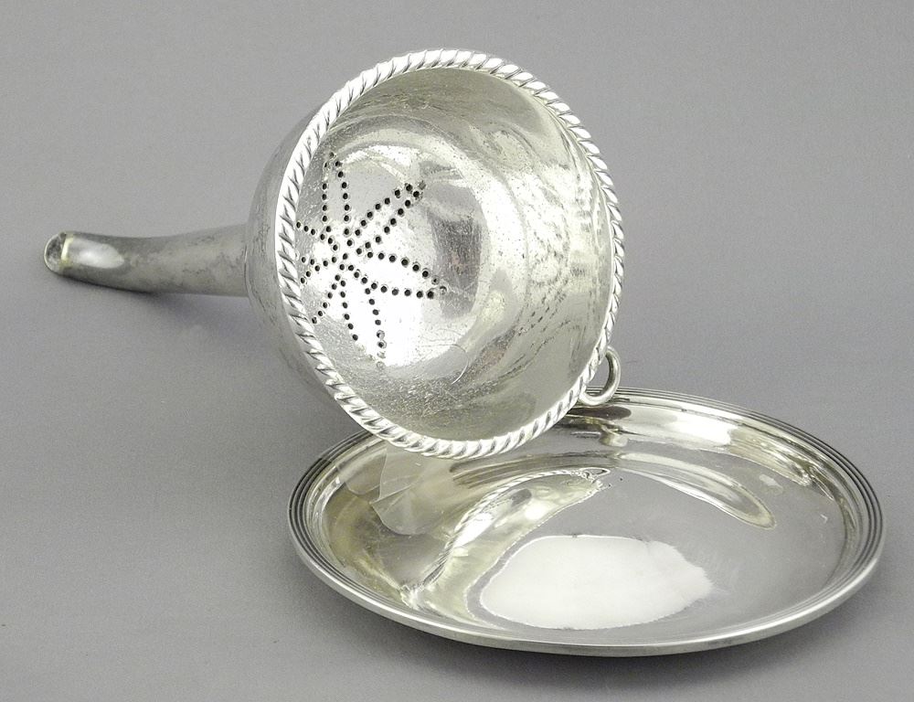 LOT 156 Georgian Silver Domed Coaster (3 7/8" diam., 43g) & Plated Funnel, 5" L. Estimate: $80 - $140 Sold For: $190 Auction Date: Tuesday, November 05 2024 at 4:00 PM