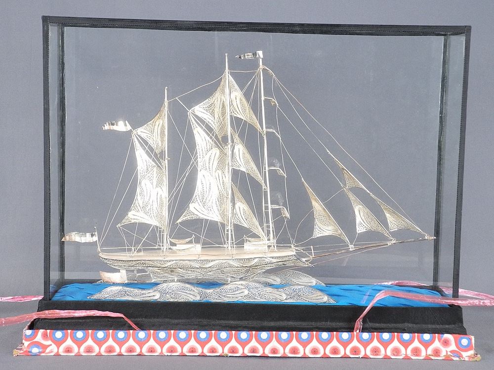 LOT 69 Indonesian Silver Boat (15 3/4"L) with Display Case. Estimate: $100 - $200 Sold For: $250 Auction Date: Tuesday, November 05 2024 at 4:00 PM