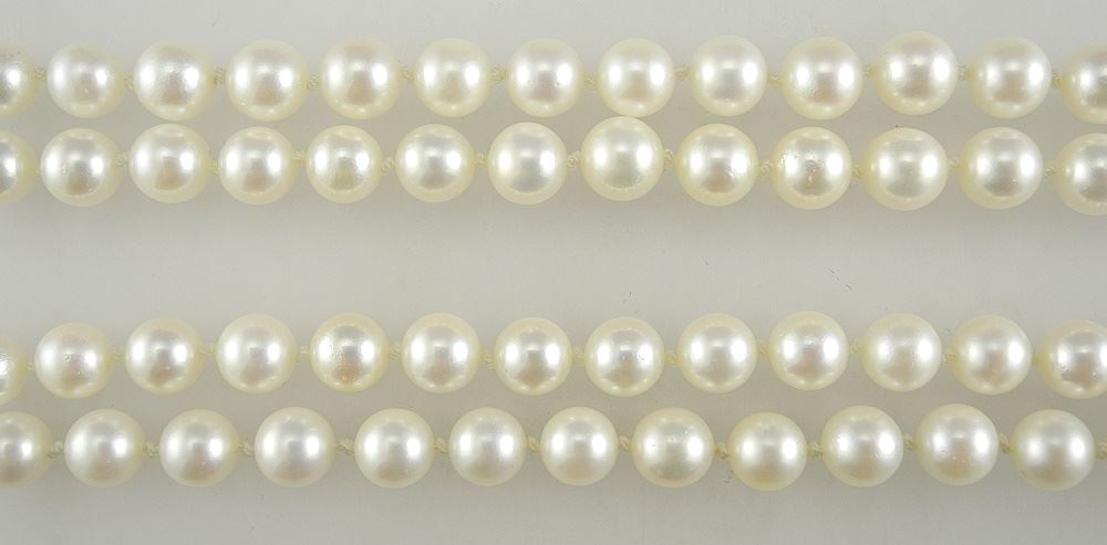 LOT 38 Double Strand Pearl Necklace, 28" with 14K Gold Clasp. Estimate: $250 - $350 Sold For: $275 Auction Date: Tuesday, November 05 2024 at 4:00 PM