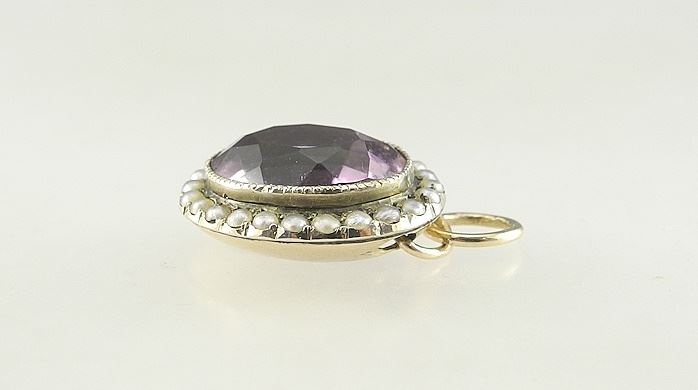 14K (tested) Yellow Gold Amethyst & Seed Pearl Pendant, 4.22g with Box.
