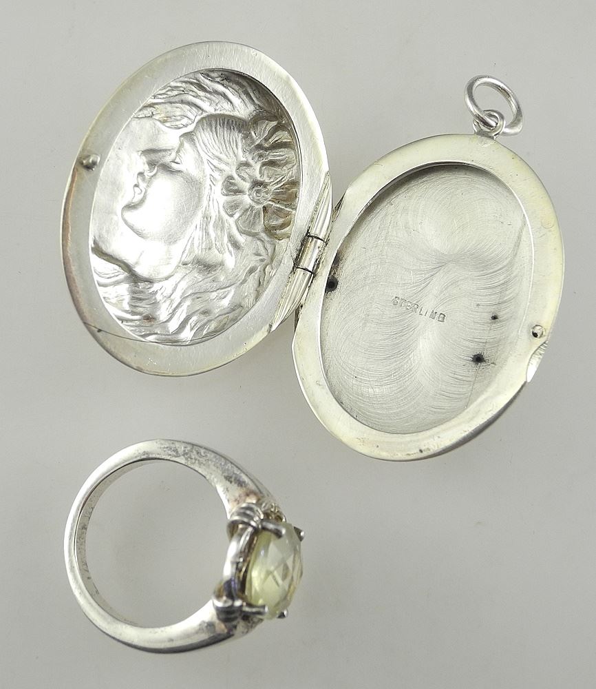 Sterling Silver Locket & Ring (12.45 g/marked) with Silver Plated Treasures Box.
