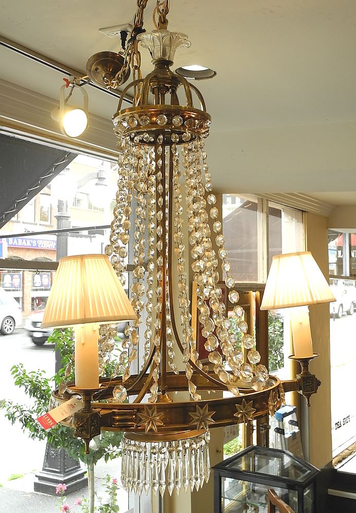 LOT 42 Empire Style Brass & Crystal Chandelier. Estimate: $200 - $300 Sold For: $375 Auction Date: Tuesday, November 05 2024 at 4:00 PM