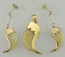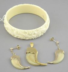LOT 300 Gold Mounted Tiger Claw Pendant, & Earrings (marked 9ct) with Tusk Bangle, 2 7/8" D., NO EXPO Estimate: $200 - $300 Sold For: $300 Auction Date: Tuesday, November 05 2024 at 4:00 PM