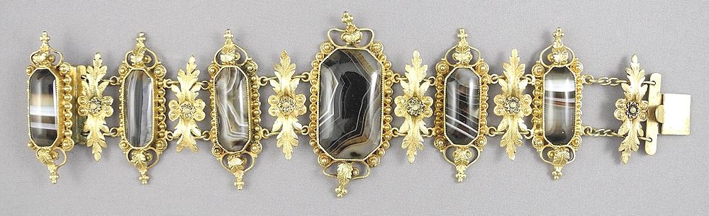 LOT 295 Victorian Pinchbeck & Agate Bracelet, 7 3/4"L, 39.1g. Estimate: $100 - $150 Sold For: $225 Auction Date: Tuesday, November 05 2024 at 4:00 PM