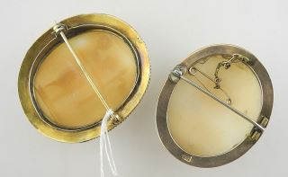 LOT 75 2 Cameo Brooches: Portrait in 9ct Frame (1 5/8"h/11.19g) & Diana in Frame, 1 3/4"h, 8.4g. Estimate: $100 - $200 Sold For: $225 Auction Date: Tuesday, November 05 2024 at 4:00 PM