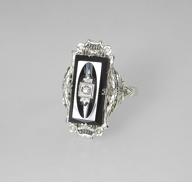 LOT 206 14K (marked) White Gold Art Deco Diamond & Onyx Ring, Size 7, 3.0g. Estimate: $200 - $300 Sold For: $200 Auction Date: Tuesday, November 05 2024 at 4:00 PM
