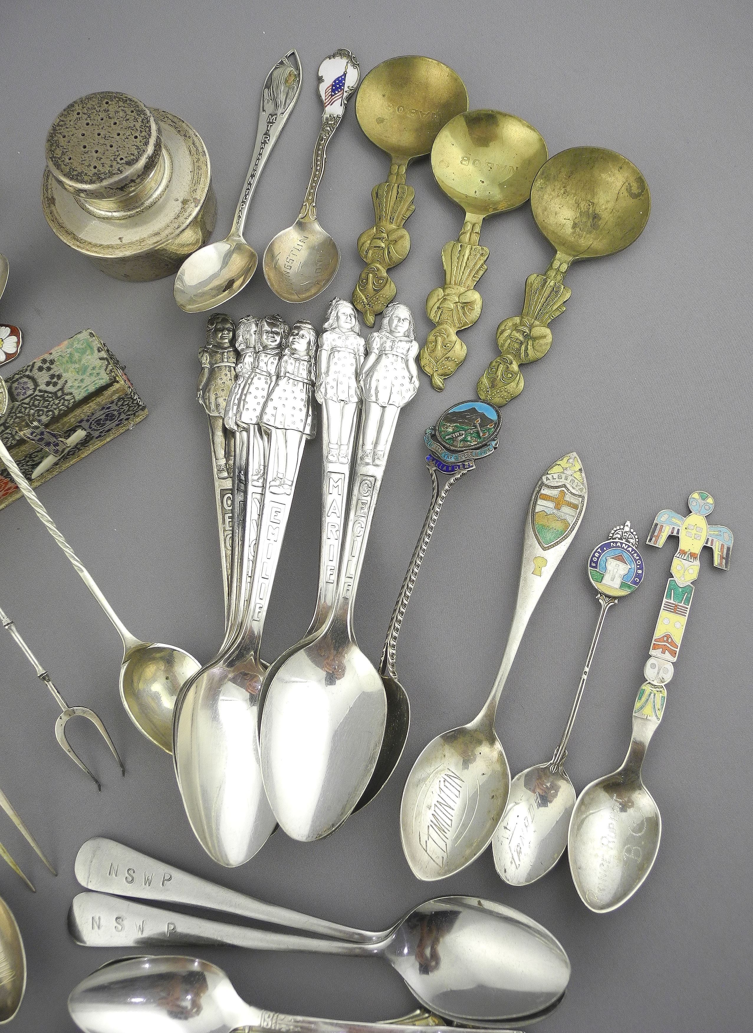 Collection of Various Souvenir Spoons & Condiments, approx. 350 grams Sterling.