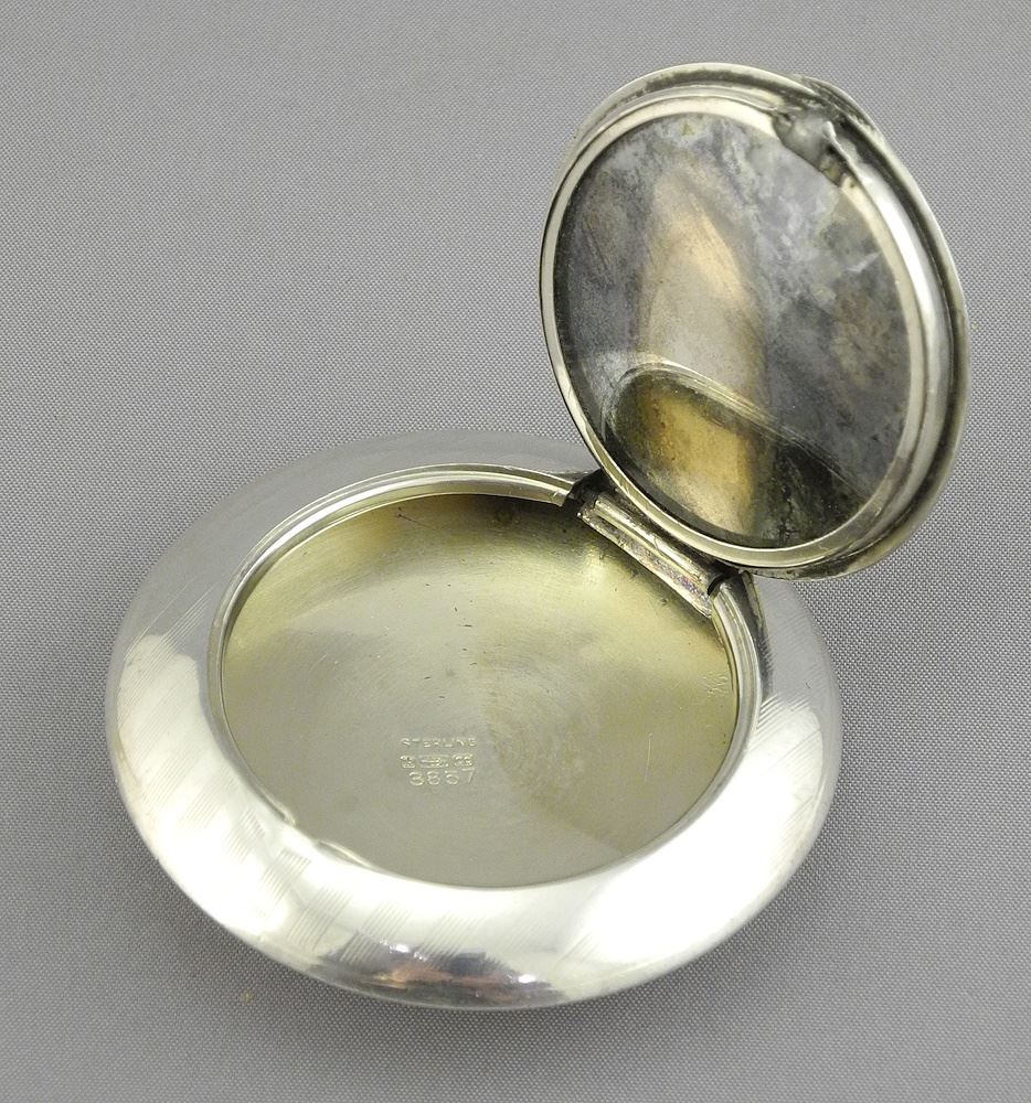 R B Co. Sterling (marked) Silver Pill/Cosmetic Box, 2 1/8" Diam., 26.52g, Inscribed.