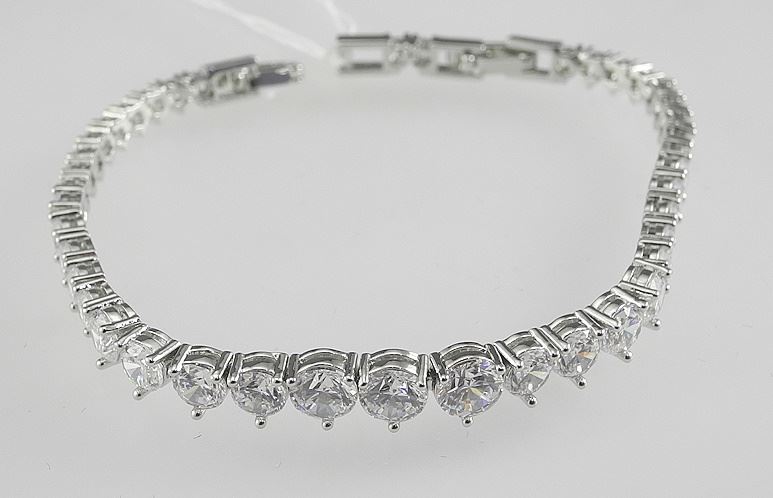 LOT 221 Platinum Plated Graduated Tennis Bracelet, 7"-7.5"L. Estimate: $50 - $80 Sold For: $100 Auction Date: Tuesday, December 03 2024 at 4:00 PM
