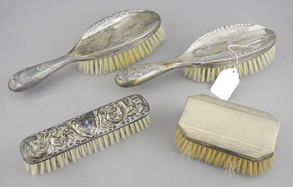 LOT 106 Four Sterling Silver Mounted Dresser Brushes, 9 3/4". Estimate: $100 - $140 Sold For: $150 Auction Date: Tuesday, December 03 2024 at 4:00 PM