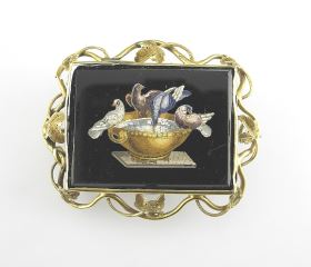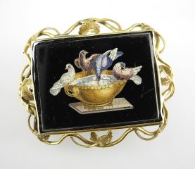 LOT 112 Italian Micro Mosaic "Pliny's Doves" Brooch in Gold Tone Frame, 2"w (scratches noted). Estimate: $350 - $450 Auction Date: Tuesday, December 03 2024 at 4:00 PM