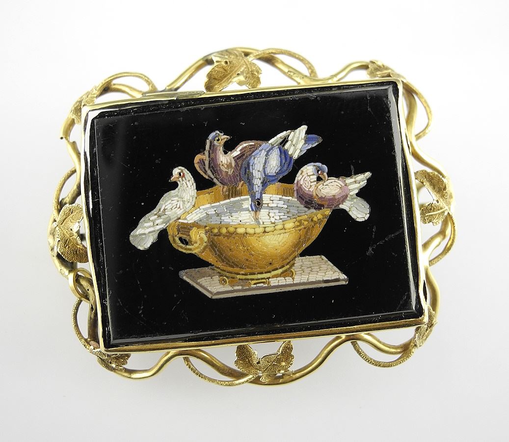 Italian Micro Mosaic "Pliny's Doves" Brooch in Gold Tone Frame, 2"w (scratches noted).