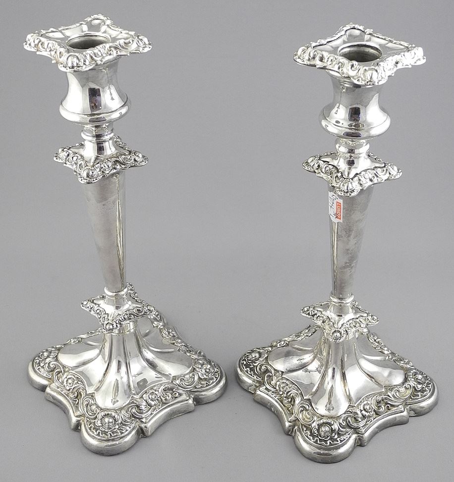 LOT 66 Pair of OSP Candlesticks & Hot Water Pot, 10 1/4" & 10 7/8"h. Estimate: $60 - $100 Sold For: $50 Auction Date: Tuesday, December 03 2024 at 4:00 PM