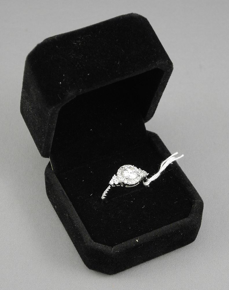 LOT 223 Sterling Silver with White Gold Overlay 1c Moissanite Ring with Certificate. Estimate: $50 - $100 Auction Date: Tuesday, December 03 2024 at 4:00 PM