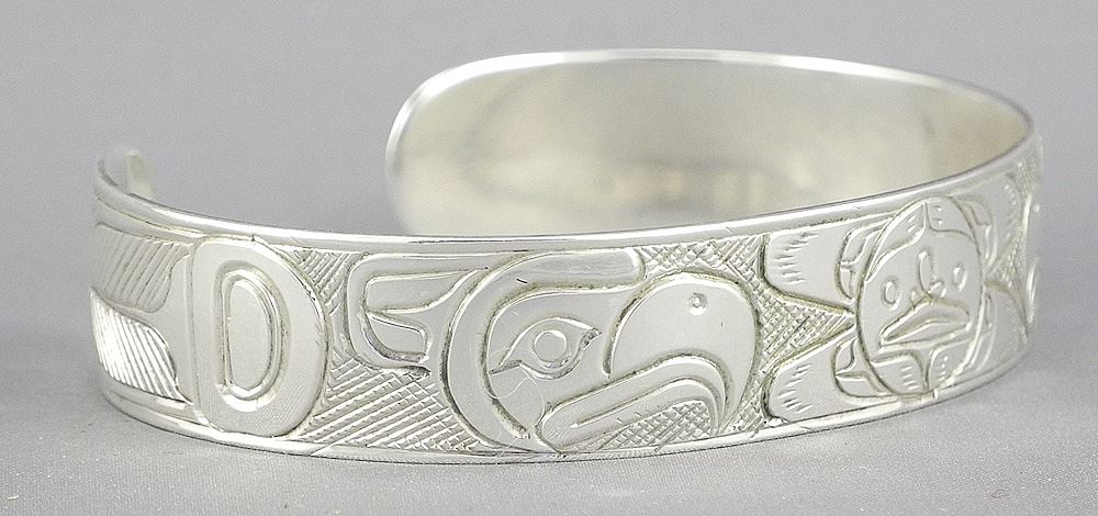 Kwagiulth Silver Bracelet signed Mike Mather "Moon", 2 3/8", 19g.