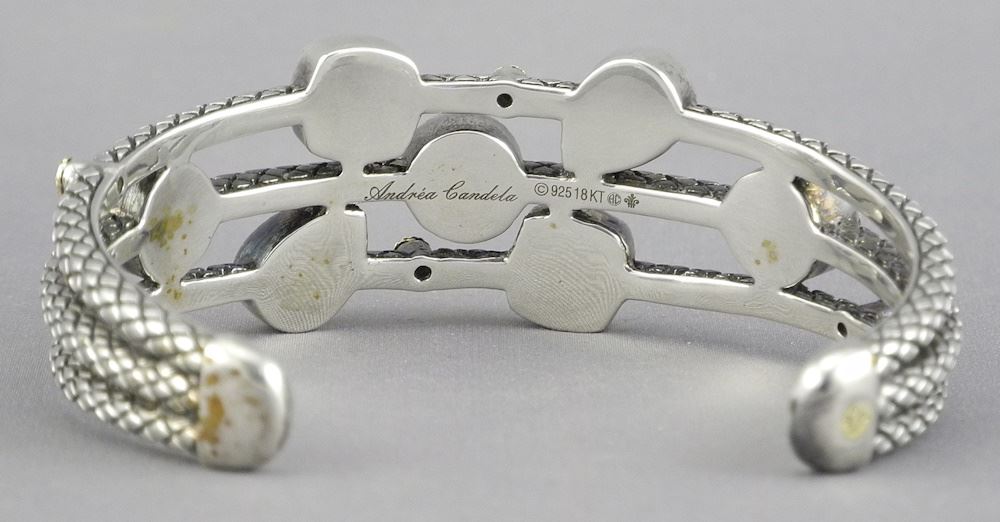 LOT 140 Birks Andrea Candela Sterling Silver & 18K Onyx Bracelet, 2 3/4"w, 51.8g. Estimate: $200 - $300 Sold For: $225 Auction Date: Tuesday, December 03 2024 at 4:00 PM