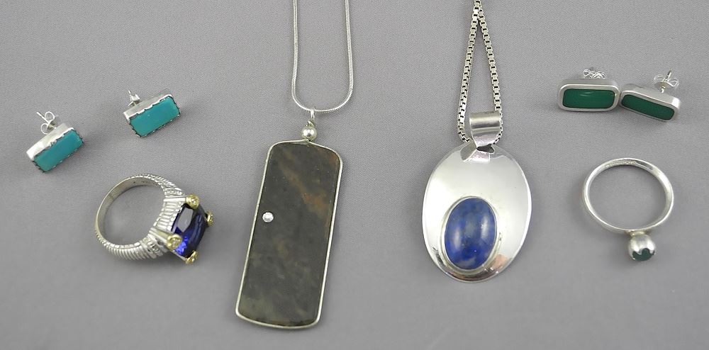 Collection of Sterling Silver Jewelry (marked variously) Set with Coloured Stones, TW 49g.