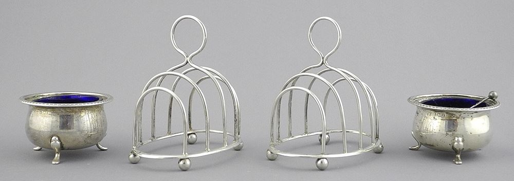LOT 217 Pair of Hallmarked Silver Toast Racks & Open Salts with Cellar Spoon , TW 150g. Estimate: $120 - $180 Sold For: $130 Auction Date: Tuesday, December 03 2024 at 4:00 PM