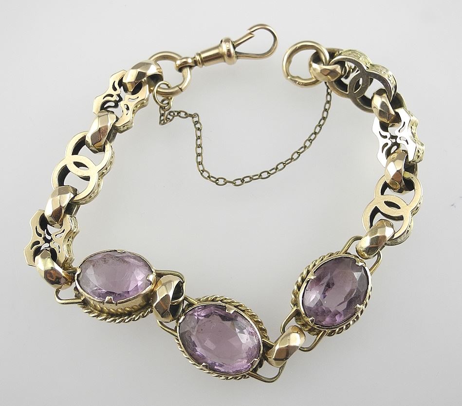 LOT 299 Antique Amethyst Bracelet in Gold Setting with Box, 6 1/4"L, 21g. Estimate: $300 - $500 Sold For: $600 Auction Date: Tuesday, December 03 2024 at 4:00 PM