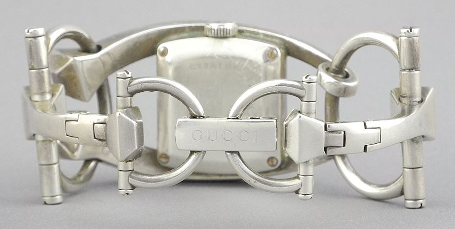 LOT 122 Gucci Sterling Silver (marked) & Mother of Pearl Ladies Wristwatch, Model 123.5. Estimate: $200 - $300 Auction Date: Tuesday, December 03 2024 at 4:00 PM