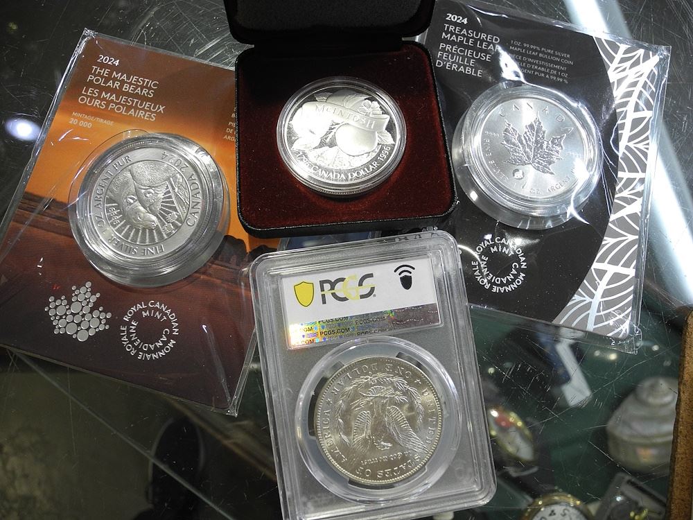 LOT 252 1881 USA Morgan Dollar/ Two 2024 Silver Maple Leafs / 1996 McIntosh. Estimate: $150 - $200 Sold For: $140 Auction Date: Tuesday, December 03 2024 at 4:00 PM