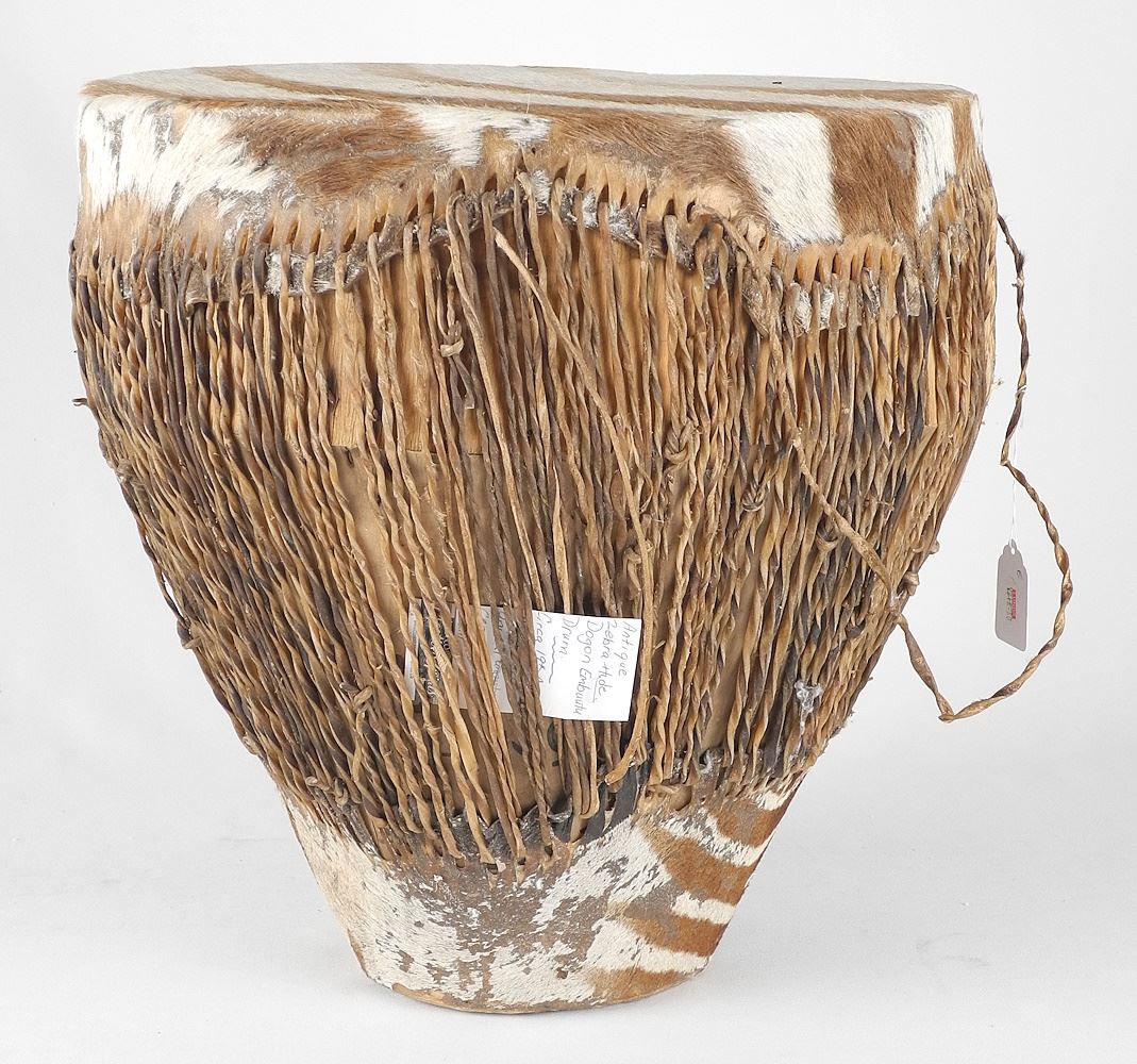 LOT 90 African Zebra Hide Drum, 14 1/2" Diameter, 14 3/4"h. Estimate: $60 - $100 Sold For: $50 Auction Date: Tuesday, December 03 2024 at 4:00 PM