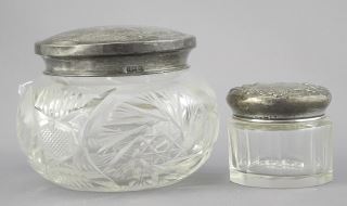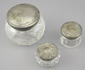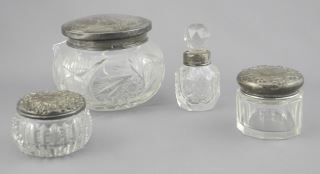 LOT 194 Four Silver Capped (hallmarked & sterling) Dresser Bottles, 1 1/2" - 3"h, 50g. Estimate: $100 - $150 Sold For: $110 Auction Date: Tuesday, December 03 2024 at 4:00 PM