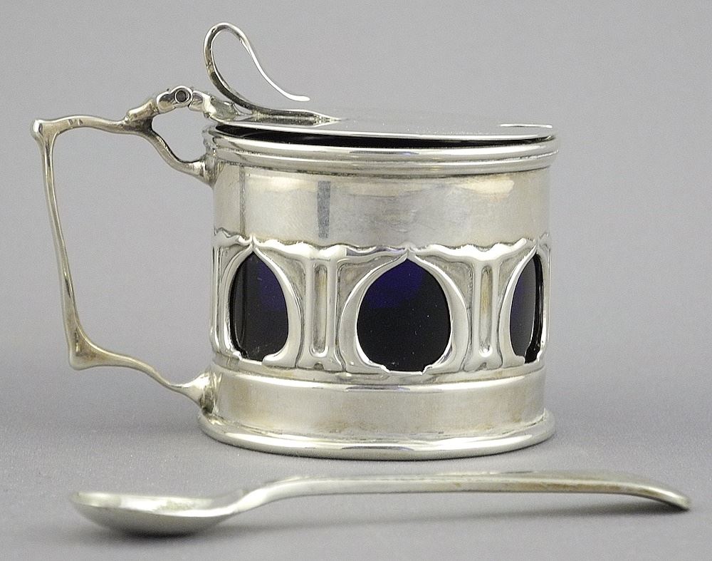 Arts & Crafts-Style Hallmarked Mustard Pot & Plated Spoon, C.1904, 73g.