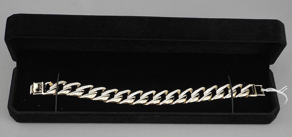 LOT 183 18K Gold Plated "Iced Out" Cuban Link Bracelet, 7 1/2"L. Estimate: $100 - $150 Sold For: $60 Auction Date: Tuesday, December 03 2024 at 4:00 PM
