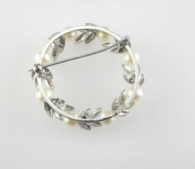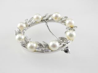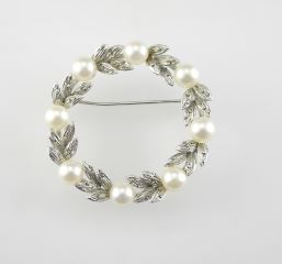 14K (marked) White Gold & Pearl Wreath Brooch, 1 5/8" Diameter, 10. 98g with Box.