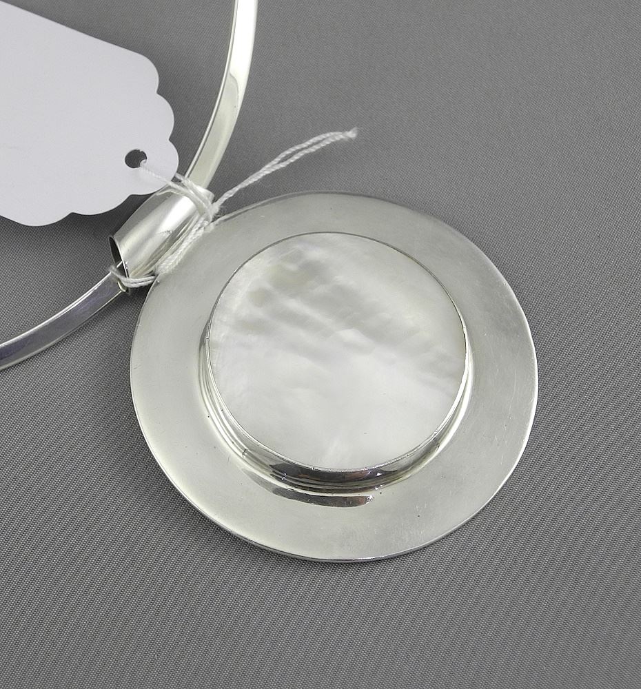 Sterling Silver Torque Necklace with Mother of Pearl Pendant, 4 3/4"w,43g