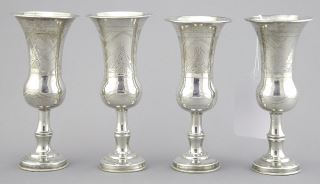 LOT 213 4 Hallmarked Silver Liqueur Goblets, 4"h, 117g. Estimate: $100 - $150 Sold For: $100 Auction Date: Tuesday, December 03 2024 at 4:00 PM