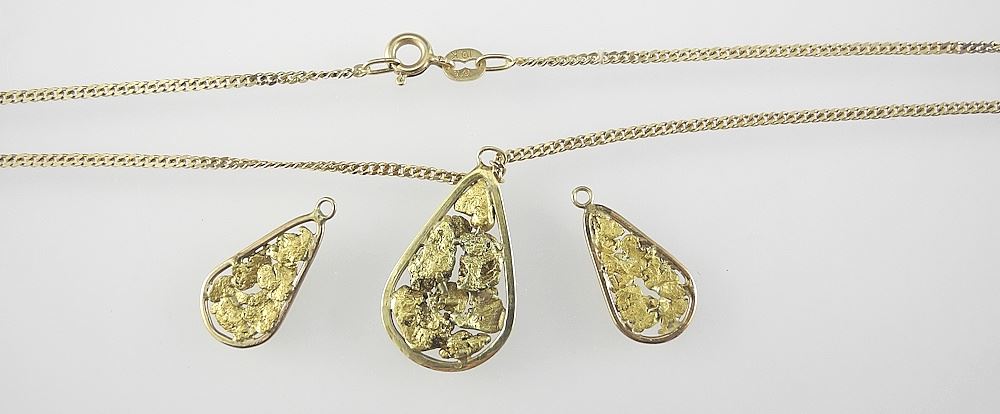 LOT 93 Placer Gold Nugget Pendant & Earrings on 10K (marked) Chain, 18"L , TW 6.52g. Estimate: $400 - $500 Sold For: $400 Auction Date: Tuesday, April 08 2025 at 4:00 PM