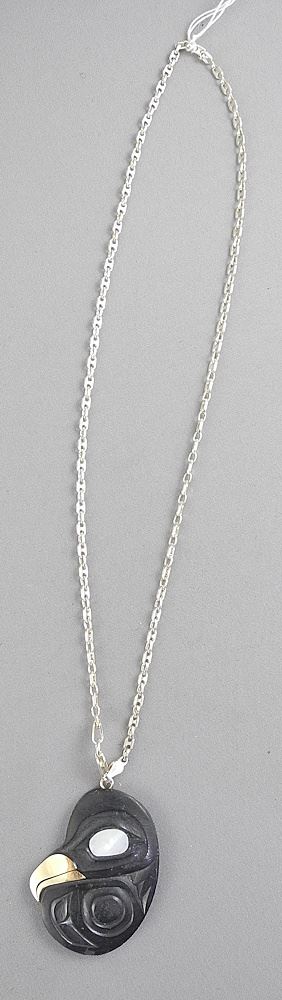 LOT 350 Argillite Gold & Mother of Pearl "Raven" Pendant on 925 Chain, 15"L. Estimate: $80 - $100 Sold For: $200 Auction Date: Tuesday, April 08 2025 at 4:00 PM