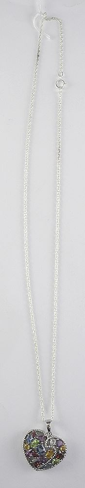 Sterling (marked 925) Silver Multi Gemstone Heart Pendant on Chain, 17"L, 6.7g.