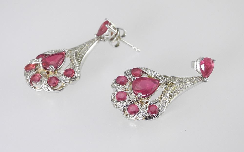 Pair of Sterling (925) Silver Ruby & Zircon Earrings, 7.6g.