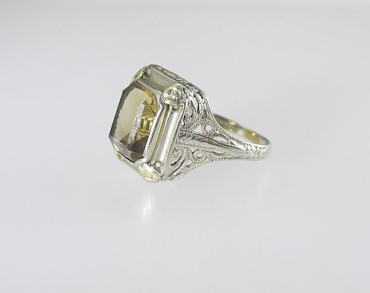 LOT 73 Art Deco 14K (marked) & Emerald Cut Yellow Stone Ring, Size 6 1/4, 2.8g. Estimate: $100 - $200 Sold For: $160 Auction Date: Tuesday, April 08 2025 at 4:00 PM