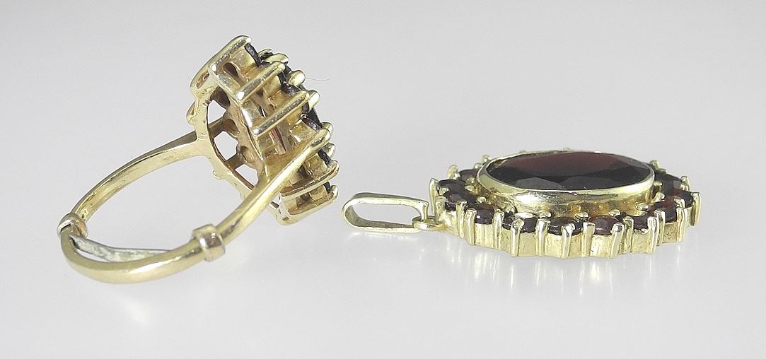 10K (marked) Gold & Garnet Ring & Pendant, Size 4, TW 9.7g.
