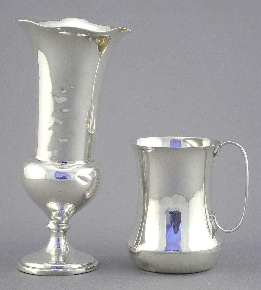 LOT 200 Hallmarked Silver Cup (59g) & Dented Vase with Weighted Base, TW 222g. Estimate: $100 - $150 Sold For: $90 Auction Date: Tuesday, April 08 2025 at 4:00 PM