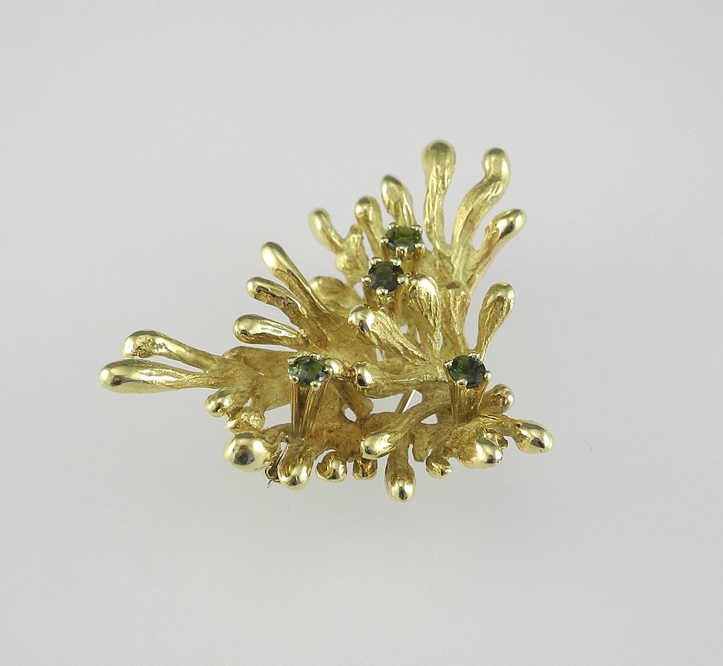 LOT 95 18K (marked 229 AL 750) Yellow Gold & Tourmaline Brooch, 1 7/8"L, 18.1g. Estimate: $1,400 - $1,500 Sold For: $1,400 Auction Date: Tuesday, April 08 2025 at 4:00 PM