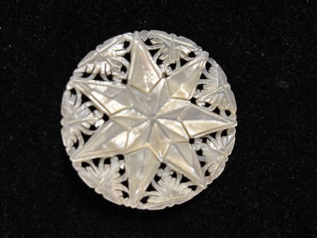 LOT 142 Mother of Pearl Six Pointed Star Brooch, 2 1/8" Diameter, 13.7g. Estimate: $50 - $70 Auction Date: Tuesday, April 08 2025 at 4:00 PM
