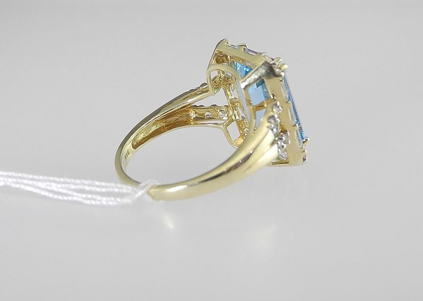 14K (marked) Gold Emerald Cut Swiss Blue & White Topaz Ring, Size 8, 5.7 g.