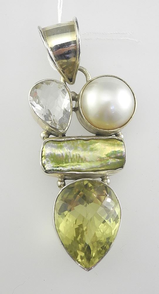 LOT 211 Indian Sterling Silver (925) Artisan Mabe Pearl/Keshi Pearl/Quartz Pendant, 2 5/8", 24.2g Estimate: $60 - $100 Sold For: $50 Auction Date: Tuesday, April 08 2025 at 4:00 PM