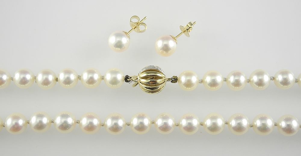 18" Strand of 7-7.5mm Cultured Pearls & Earrings with Gold & Diamond Clasp.