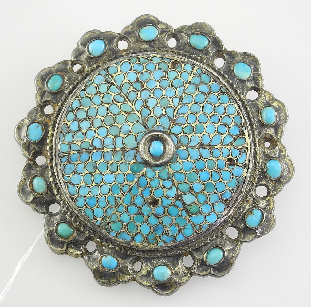 Ethnic Silver Alloy (tested) & Turquoise Brooch, 2 7/8" Diameter, 48.16g.