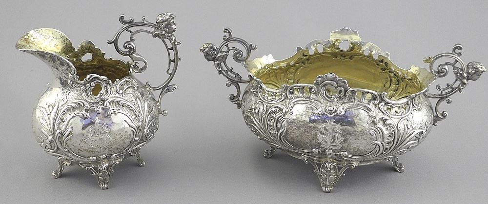 German .800 Silver (marked) Baroque- Style Cream & Sugar, 3 1/4"h, 250g.